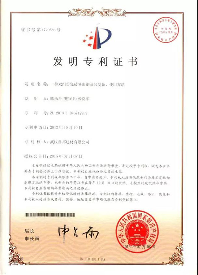 本發(fā)明的目的在于克服因現(xiàn)有瓷磚特別是?;u因吸水率低、界面光滑導致瓷磚脫落的問題,提供一種改善瓷磚界面性能和施工性能的雙組份瓷磚界面劑,提高了界面劑與瓷磚粘結(jié)強度。另外,在保證施工時間的同時,縮短了凝固時間,有效改善了施工性能,并保證了瓷磚的長期美觀性。